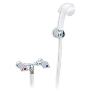 The Ambassador Marine Trinidad 2 Handle External Shower Mixer in Chrome and Warm White offers a compact and durable solution for marine and RV shower applications. This unit features a small, heavy-duty sprayer with full shut-off and flow control capabilities via an ergonomic trigger. The sprayer connects to a 72-inch white rubber hose and mounts using a two-hole, 4-inch center-to-center configuration. Designed for easy bulkhead installation on thin fiberglass walls, this non-pressure balanced system includes compression valves and a solid brass body with metal handles for lasting performance. Compatible with standard 1/2" NPS-M plumbing fittings.